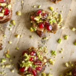 Layers of smashed dates, creamy peanut butter, and rich melted chocolate come together in these easy no-bake dessert bites, finished with crunchy pistachios and juicy pomegranate seeds. Chill, slice, and enjoy a naturally sweet treat that’s perfect for sharing—or keeping all to yourself.